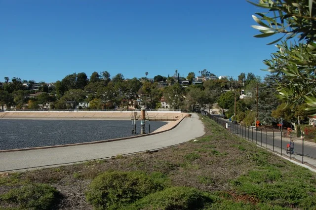 Converting the current LADWP roadway that runs along the north rim of Ivanhoe Reservoir would provide such access. Elevated above the Tesla Walking Path, this roadway has unobstructed views of the Silver Lake Hills and the Glendale/San Gabriel mountains in the distance. Runners and walkers could enter from the LADWP gate at Tesla Avenue/West Silver Lake Boulevard, or from the eastern edge of Ivanhoe just behind the Nursery School.
